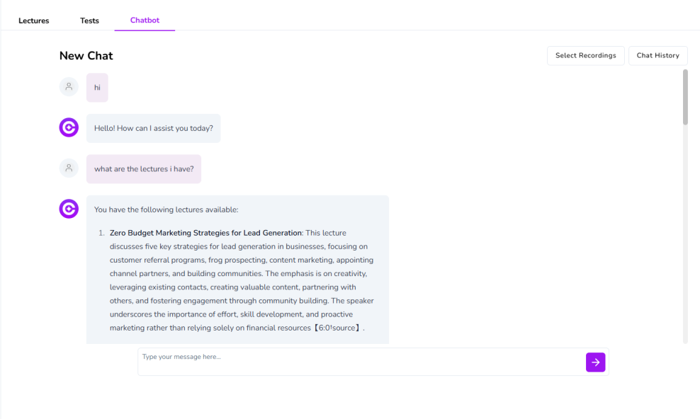 An intelligent AI assistant designed to answer queries, provide clarifications, and help users interact with their transcriptions and summaries efficiently. Perfect for students or professionals needing quick access to information.